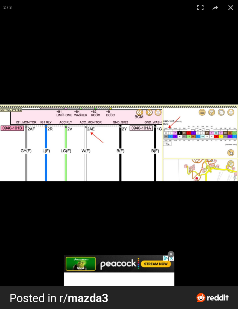 During the initial install, I accidentally attached the 12v contsant BATT cable to the BCM ACC wire (2AE) and on the second startup the car threw a CEL and killed signal to that wire while car was running or when the ACC mode was initialized. I suspect the dashcam was drawing excessive amperage from the BCM wire instead of the fusebox and the car dynamically disabled this output to prevent any issues. Realizing my mistake, I cleared the CEL manually and unplugged the car battery for 15 minutes to reset the ECU. After this reset, wire 2AE started reading 12v as normal with the car on and in ACC mode.